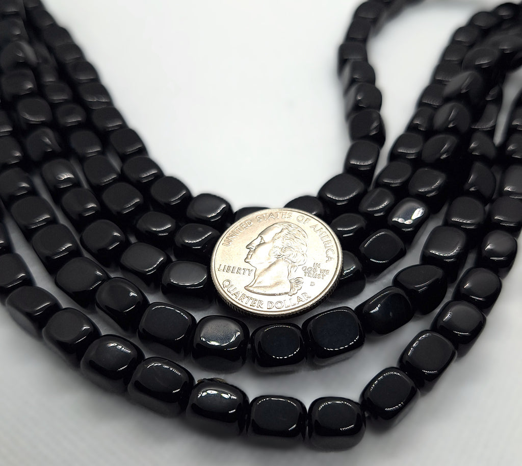 Black onyx faceted nugget stone beads measuring about 10x6mm each. Each package is one 16-inch strand, which is about 40 beads. The hole size is approximately 1mm. You will receive beads from the same batch as those pictured; these are representative of the actual beads being sold here, not picked through for the best examples. These beads are acquired in bulk, and often little is known about their origins; identification is made based on appearance, and enhancements are noted whenever possible. We're happy to answer any questions you might have about these, and represent their grade to our best ability. Please note that these are natural products with the attendant variations in color and shape, and the appearance may change slightly from one monitor to another. Check out our other products for an amazing selection of beads, cabochons and findings, and to save big on shipping.