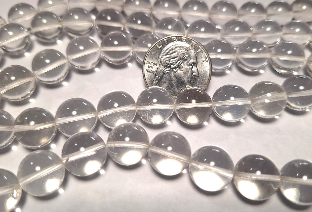 Crystal quartz 12mm round stone beads. Each package is one 16-inch strand, which is about 33-34 beads. The hole size is approximately 1mm. You will receive beads from the same batch as those pictured; these are representative of the actual beads being sold here, not picked through for the best examples. These beads are acquired in bulk, and often little is known about their origins; identification is made based on appearance, and enhancements are noted whenever possible. We're happy to answer any questions you might have about these, and represent their grade to our best ability. Please note that these are natural products with the attendant variations in color and shape, and the appearance may change slightly from one monitor to another. Check out our other products for an amazing selection of beads, cabochons and findings, and to save big on shipping.