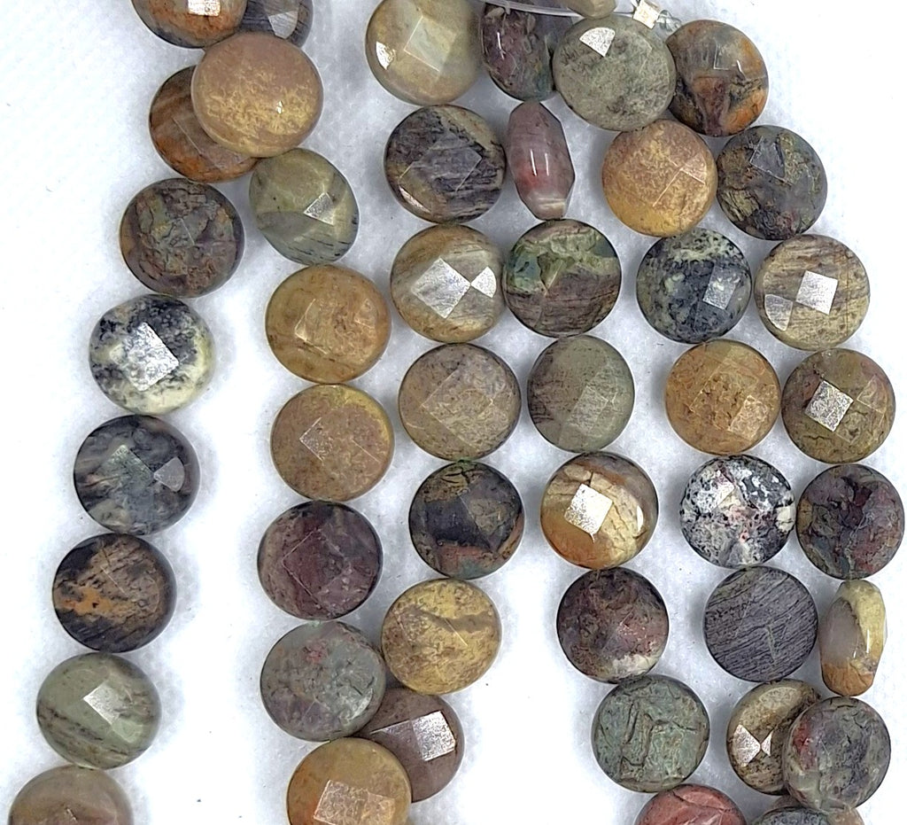 Picasso jasper 12mm faceted puff coin gemstone beads. Each package is one 16-inch strand, which is about 33-34 beads. The hole size is approximately 1mm. You will receive beads from the same batch as those pictured; these are representative of the actual beads being sold here, not picked through for the best examples. These beads are acquired in bulk, and often little is known about their origins; identification is made based on appearance, and enhancements are noted whenever possible. We're happy to answer any questions you might have about these, and represent their grade to our best ability. Please note that these are natural products with the attendant variations in color and shape, and the appearance may change slightly from one monitor to another. Check out our other products for an amazing selection of beads, cabochons and findings, and to save big on shipping.