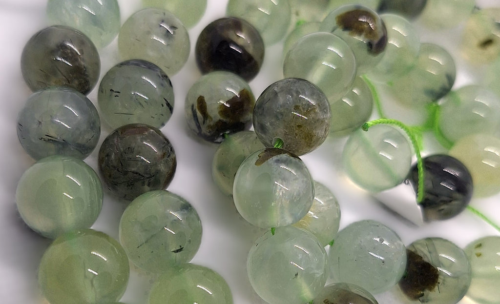 Prehnite 12mm round gemstone beads. Each package is one 16-inch strand, which is about 33-34 beads. The hole size is approximately 1mm. You will receive beads from the same batch as those pictured; these are representative of the actual beads being sold here, not picked through for the best examples. These beads are acquired in bulk, and often little is known about their origins; identification is made based on appearance, and enhancements are noted whenever possible. We're happy to answer any questions you might have about these, and represent their grade to our best ability. Please note that these are natural products with the attendant variations in color and shape, and the appearance may change slightly from one monitor to another. Check out our other products for an amazing selection of beads, cabochons and findings, and to save big on shipping.