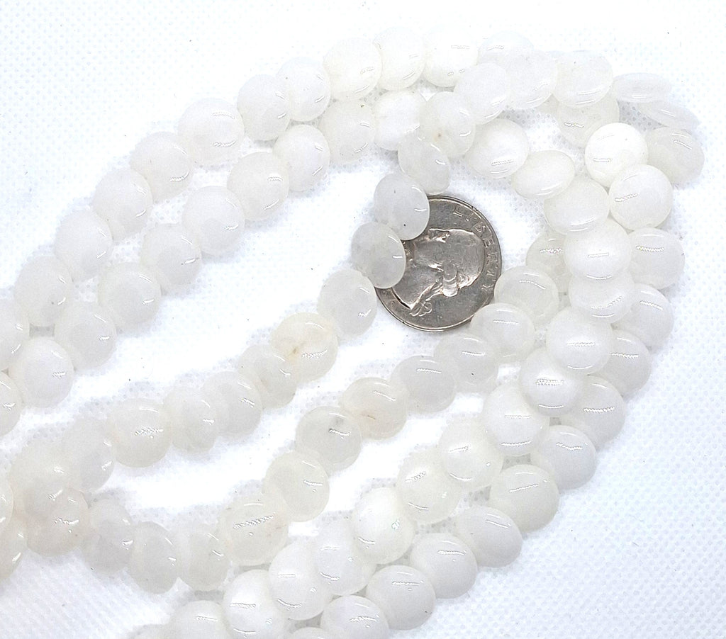 White quartz gemstone beads in a slightly puffed 12mm flat lentil shape. Each package is one 16-inch strand, which is about 33-34 beads. The hole size is approximately 1mm. You will receive beads from the same batch as those pictured; these are representative of the actual beads being sold here, not picked through for the best examples. These beads are acquired in bulk, and often little is known about their origins; identification is made based on appearance, and enhancements are noted whenever possible. We're happy to answer any questions you might have about these, and represent their grade to our best ability. Please note that these are natural products with the attendant variations in color and shape, and the appearance may change slightly from one monitor to another. Check out our other products for an amazing selection of beads, cabochons and findings, and to save big on shipping.