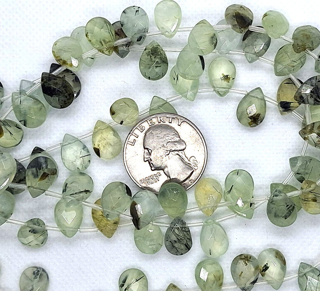 Prehnite 12x8mm faceted teardop briolette gemstone beads. Each package is one 16-inch strand, which is about 33 beads. The hole size is approximately .8mm. You will receive beads from the same batch as those pictured; these are representative of the actual beads being sold here, not picked through for the best examples. These beads are acquired in bulk, and often little is known about their origins; identification is made based on appearance, and enhancements are noted whenever possible. We're happy to answer any questions you might have about these, and represent their grade to our best ability. Please note that these are natural products with the attendant variations in color and shape, and the appearance may change slightly from one monitor to another. Check out our other products for an amazing selection of beads, cabochons and findings, and to save big on shipping.