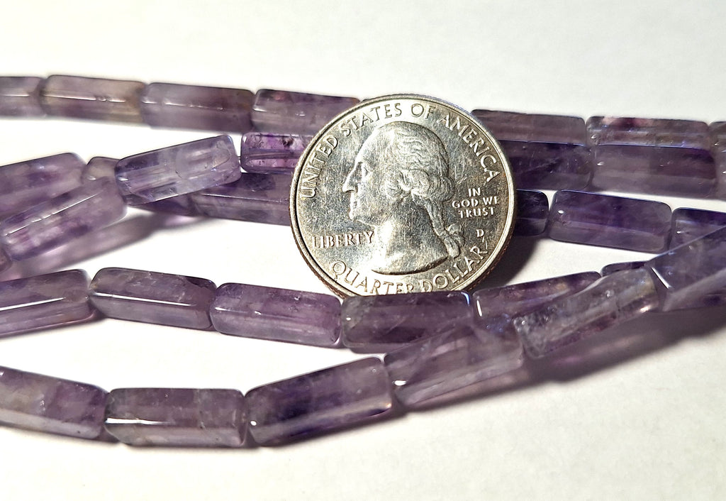 Cape amethyst gemstone 13x4mm square cylinder/tube beads. Each package is one 16-inch strand, which is about 30-31 beads. The hole size is approximately 1mm. You will receive beads from the same batch as those pictured; these are representative of the actual beads being sold here, not picked through for the best examples. These beads are acquired in bulk, and often little is known about their origins; identification is made based on appearance, and enhancements are noted whenever possible. We're happy to answer any questions you might have about these, and represent their grade to our best ability. Please note that these are natural products with the attendant variations in color and shape, and the appearance may change slightly from one monitor to another. Check out our other products for an amazing selection of beads, cabochons and findings, and to save big on shipping.