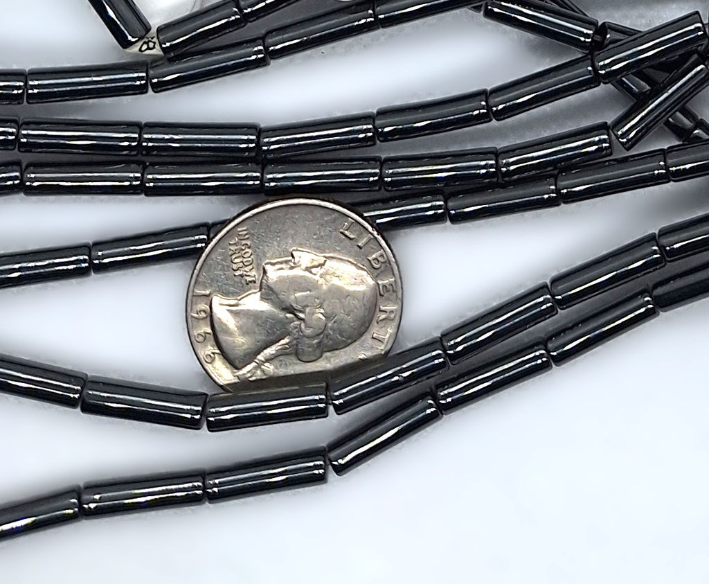 Hematite 13x4mm round cylinder/tube-shaped gemstone beads. Each package is one 16-inch strand, which is about 30-31 beads. The hole size is approximately 1mm. You will receive beads from the same batch as those pictured; these are representative of the actual beads being sold here, not picked through for the best examples. These beads are acquired in bulk, and often little is known about their origins; identification is made based on appearance, and enhancements are noted whenever possible. We're happy to answer any questions you might have about these, and represent their grade to our best ability. Please note that these are natural products with the attendant variations in color and shape, and the appearance may change slightly from one monitor to another. Check out our other products for an amazing selection of beads, cabochons and findings, and to save big on shipping.