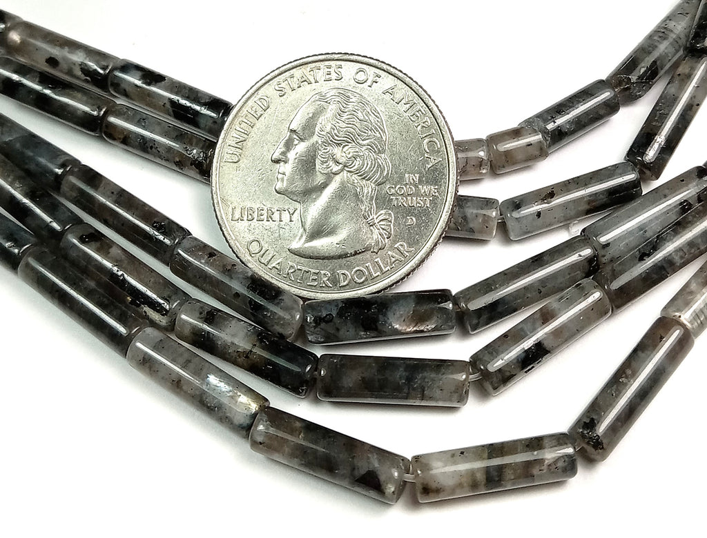 Larvikite 13x4mm tube-shaped gemstone beads. Each package is one 8-inch strand, which is about 15-16 beads. The hole size is approximately 1mm. You will receive beads from the same batch as those pictured; these are representative of the actual beads being sold here, not picked through for the best examples. These beads are acquired in bulk, and often little is known about their origins; identification is made based on appearance, and enhancements are noted whenever possible. We're happy to answer any questions you might have about these, and represent their grade to our best ability. Please note that these are natural products with the attendant variations in color and shape, and the appearance may change slightly from one monitor to another. Check out our other products for an amazing selection of beads, cabochons and findings, and to save big on shipping.