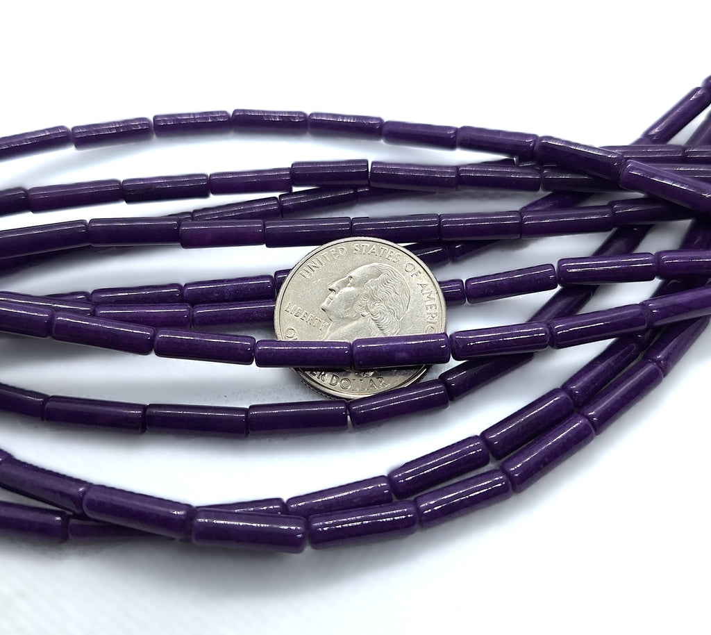 Purple dyed common jade gemstone 13x4mm cylinder/tube beads. Each package is one 16-inch strand, which is about 30-31 beads. The hole size is approximately 1mm. You will receive beads from the same batch as those pictured; these are representative of the actual beads being sold here, not picked through for the best examples. These beads are acquired in bulk, and often little is known about their origins; identification is made based on appearance, and enhancements are noted whenever possible. We're happy to answer any questions you might have about these, and represent their grade to our best ability. Please note that these are natural products with the attendant variations in color and shape, and the appearance may change slightly from one monitor to another. Check out our other products for an amazing selection of beads, cabochons and findings, and to save big on shipping.