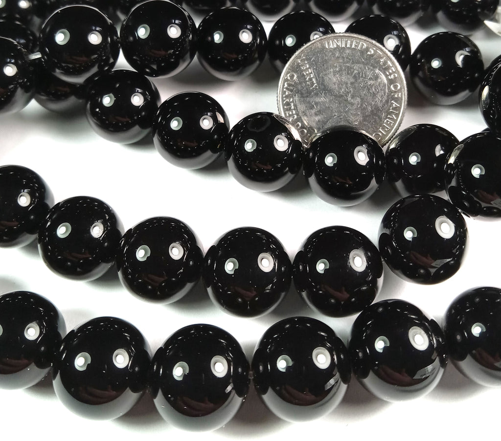 Black onyx 14mm round gemstone beads. Each package is one 8-inch strand, which is about 14 beads. The hole size is approximately 1mm. You will receive beads from the same batch as those pictured; these are representative of the actual beads being sold here, not picked through for the best examples. These beads are acquired in bulk, and often little is known about their origins; identification is made based on appearance, and enhancements are noted whenever possible. We're happy to answer any questions you might have about these, and represent their grade to our best ability. Please note that these are natural products with the attendant variations in color and shape, and the appearance may change slightly from one monitor to another. Check out our other products for an amazing selection of beads, cabochons and findings, and to save big on shipping.