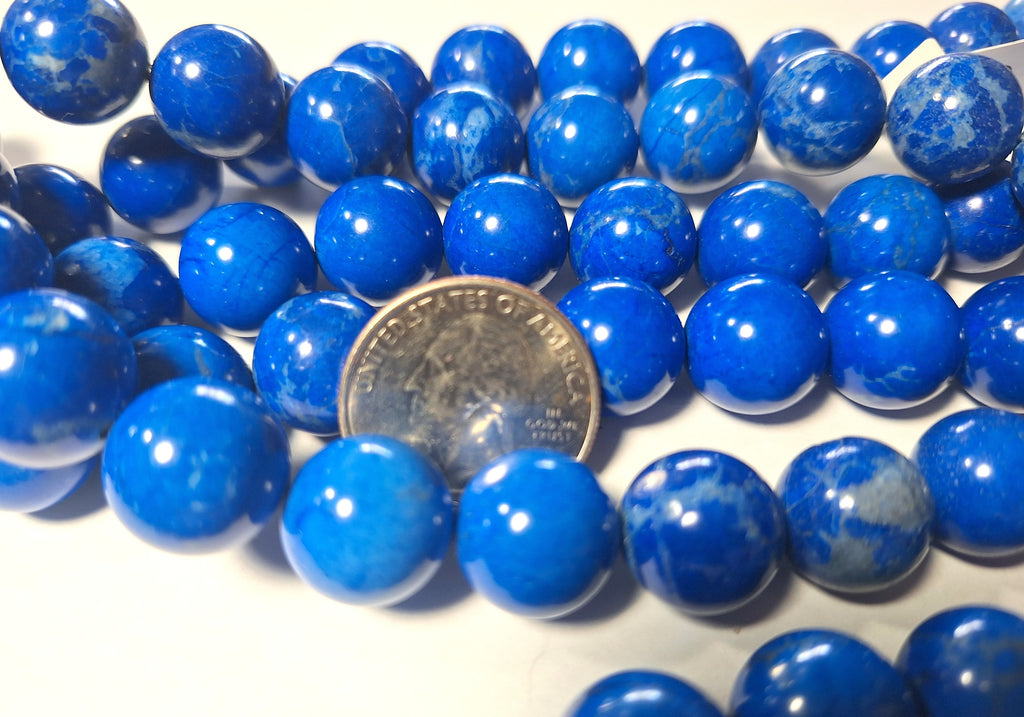 Lapis blue dyed howlite large 14mm round gemstone beads. Each package is one 16-inch strand, which is about 28-29 beads. The hole size is approximately 1mm. You will receive beads from the same batch as those pictured; these are representative of the actual beads being sold here, not picked through for the best examples. These beads are acquired in bulk, and often little is known about their origins; identification is made based on appearance, and enhancements are noted whenever possible. We're happy to answer any questions you might have about these, and represent their grade to our best ability. Please note that these are natural products with the attendant variations in color and shape, and the appearance may change slightly from one monitor to another. Check out our other products for an amazing selection of beads, cabochons and findings, and to save big on shipping.