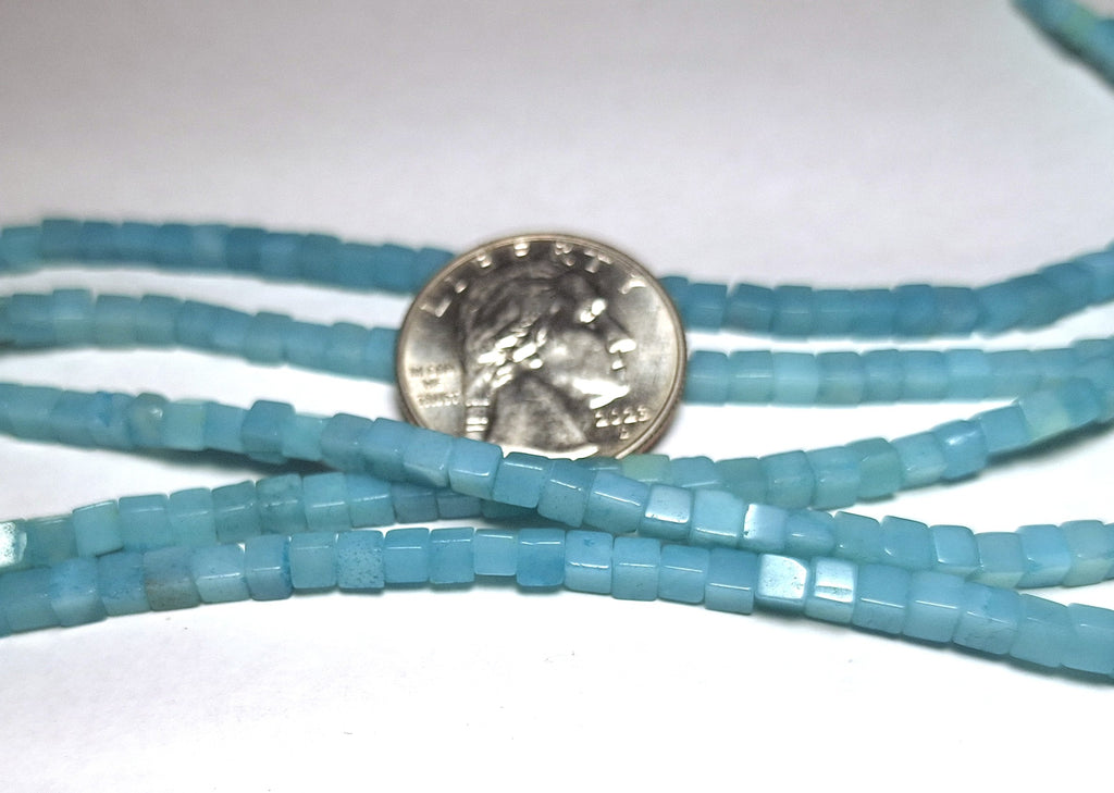 Amazonite dyed gemstone beads in a 3mm cube, perfect for spacers and accents. Each package is one 16-inch strand, which is about 133-134 beads. The hole size is approximately .8mm. You will receive beads from the same batch as those pictured; these are representative of the actual beads being sold here, not picked through for the best examples. These beads are acquired in bulk, and often little is known about their origins; identification is made based on appearance, and enhancements are noted whenever possible. We're happy to answer any questions you might have about these, and represent their grade to our best ability. Please note that these are natural products with the attendant variations in color and shape, and the appearance may change slightly from one monitor to another. Check out our other products for an amazing selection of beads, cabochons and findings, and to save big on shipping.