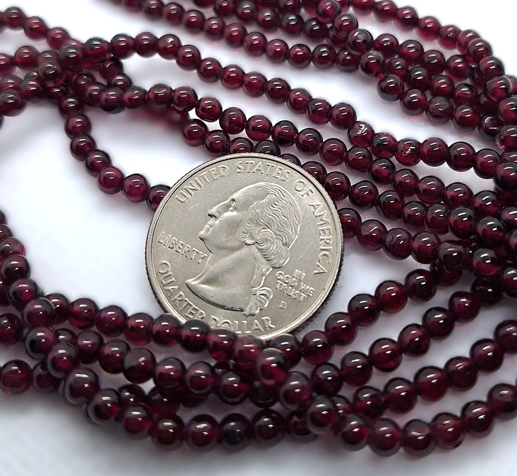 Garnet gemstone beads in a 3mm round, perfect for spacers and accents. Each package is one 16-inch strand, which is about 133-134 beads. The hole size is approximately .8mm. You will receive beads from the same batch as those pictured; these are representative of the actual beads being sold here, not picked through for the best examples. These beads are acquired in bulk, and often little is known about their origins; identification is made based on appearance, and enhancements are noted whenever possible. We're happy to answer any questions you might have about these, and represent their grade to our best ability. Please note that these are natural products with the attendant variations in color and shape, and the appearance may change slightly from one monitor to another. Check out our other products for an amazing selection of beads, cabochons and findings, and to save big on shipping.