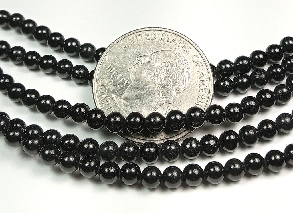 Black spinel 4mm round gemstone beads. Each package is one 8-inch strand, which is about 50 beads. The hole size is approximately 1mm. You will receive beads from the same batch as those pictured; these are representative of the actual beads being sold here, not picked through for the best examples. These beads are acquired in bulk, and often little is known about their origins; identification is made based on appearance, and enhancements are noted whenever possible. We're happy to answer any questions you might have about these, and represent their grade to our best ability. Please note that these are natural products with the attendant variations in color and shape, and the appearance may change slightly from one monitor to another. Check out our other products for an amazing selection of beads, cabochons and findings, and to save big on shipping.