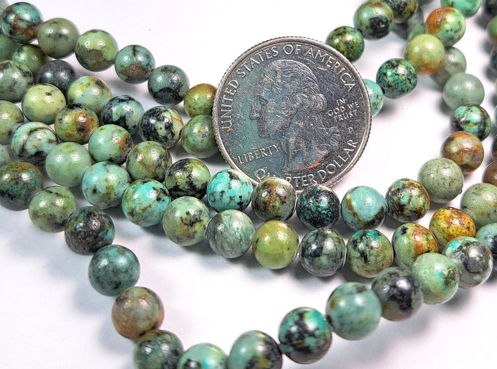 African turquoise 6mm round gemstone beads. Each package is one 8-inch strand, which is about 33-34 beads. The hole size is approximately 1mm. You will receive beads from the same batch as those pictured; these are representative of the actual beads being sold here, not picked through for the best examples. These beads are acquired in bulk, and often little is known about their origins; identification is made based on appearance, and enhancements are noted whenever possible. We're happy to answer any questions you might have about these, and represent their grade to our best ability. Please note that these are natural products with the attendant variations in color and shape, and the appearance may change slightly from one monitor to another. Check out our other products for an amazing selection of beads, cabochons and findings, and to save big on shipping.
