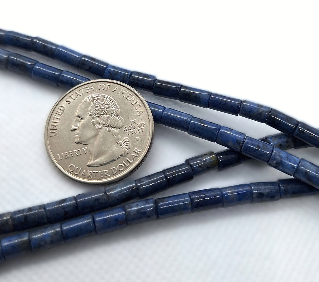 Dumortierite 6x4mm cylinder tube gemstone beads. Each package is one 16-inch strand, which is about 66-67 beads. The hole size is approximately 1mm. You will receive beads from the same batch as those pictured; these are representative of the actual beads being sold here, not picked through for the best examples. These beads are acquired in bulk, and often little is known about their origins; identification is made based on appearance, and enhancements are noted whenever possible. We're happy to answer any questions you might have about these, and represent their grade to our best ability. Please note that these are natural products with the attendant variations in color and shape, and the appearance may change slightly from one monitor to another. Check out our other products for an amazing selection of beads, cabochons and findings, and to save big on shipping.