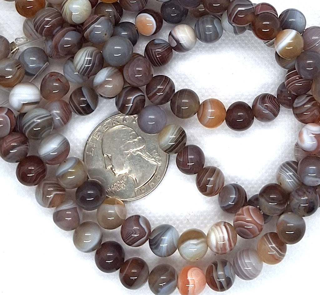 Botswana agate 8mm round gemstone beads. Each package is one 16-inch strand, which is about 50 beads. The hole size is approximately 1mm. You will receive beads from the same batch as those pictured; these are representative of the actual beads being sold here, not picked through for the best examples. These beads are acquired in bulk, and often little is known about their origins; identification is made based on appearance, and enhancements are noted whenever possible. We're happy to answer any questions you might have about these, and represent their grade to our best ability. Please note that these are natural products with the attendant variations in color and shape, and the appearance may change slightly from one monitor to another. Check out our other products for an amazing selection of beads, cabochons and findings, and to save big on shipping.