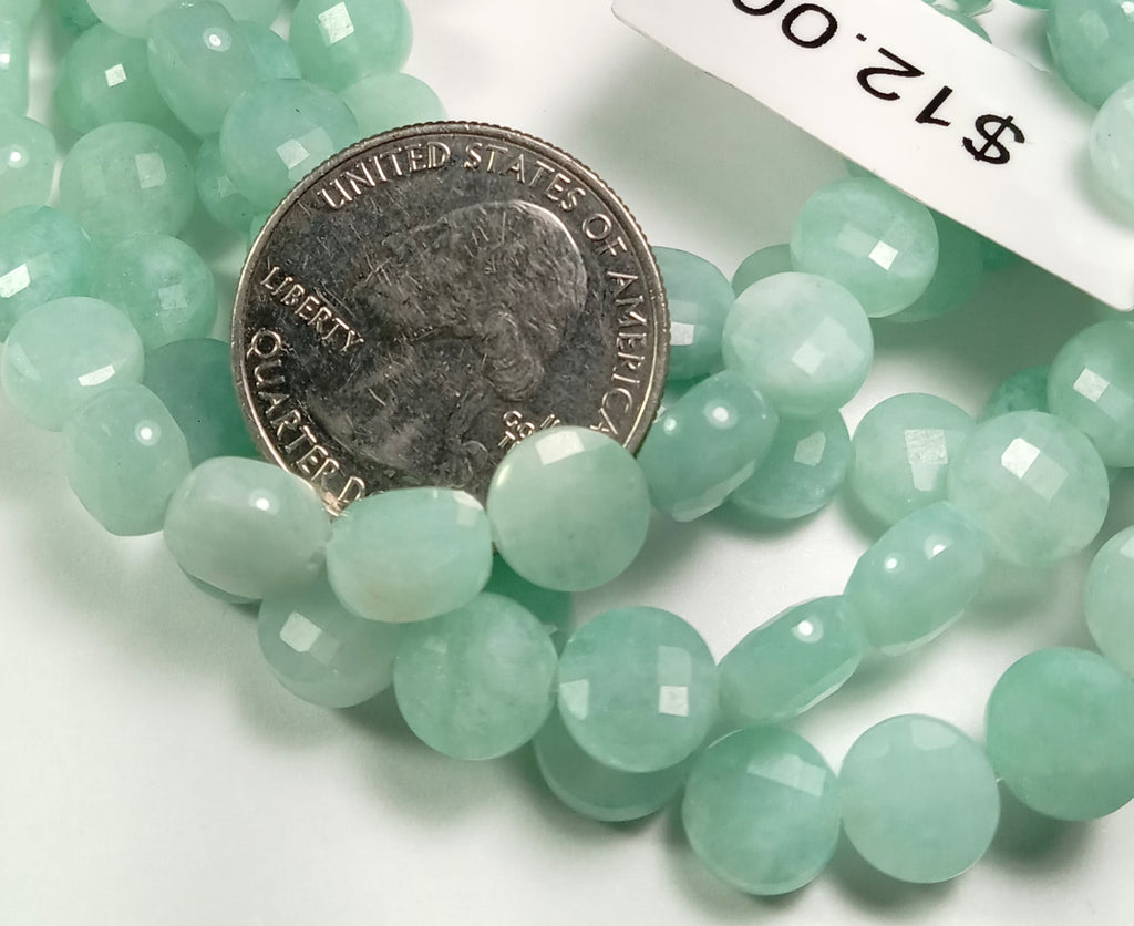 Green dyed "candy jade" 8mm faceted coin-shaped gemstone beads. Each package is one 8-inch strand, which is about 25 beads. The hole size is approximately 1mm. You will receive beads from the same batch as those pictured; these are representative of the actual beads being sold here, not picked through for the best examples. These beads are acquired in bulk, and often little is known about their origins; identification is made based on appearance, and enhancements are noted whenever possible. We're happy to answer any questions you might have about these, and represent their grade to our best ability. Please note that these are natural products with the attendant variations in color and shape, and the appearance may change slightly from one monitor to another. Check out our other products for an amazing selection of beads, cabochons and findings, and to save big on shipping.