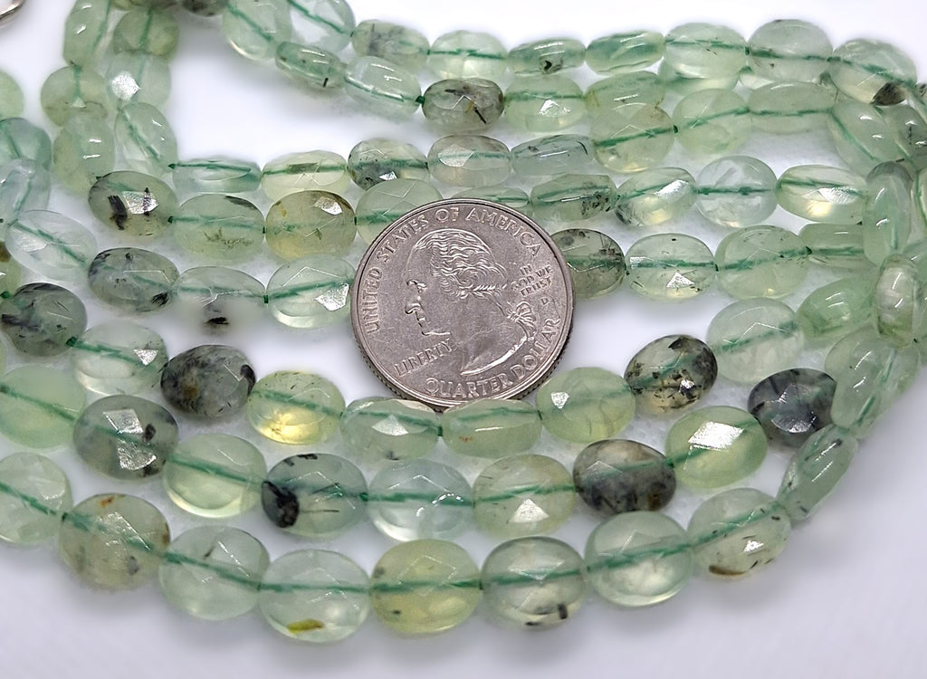 Prehnite faceted oval gemstone beads measuring 10mm long by 8mm wide. Each package is one 16-inch strand, which is about 40 beads. The hole size is approximately 1mm. You will receive beads from the same batch as those pictured; these are representative of the actual beads being sold here, not picked through for the best examples. These beads are acquired in bulk, and often little is known about their origins; identification is made based on appearance, and enhancements are noted whenever possible. We're happy to answer any questions you might have about these, and represent their grade to our best ability. Please note that these are natural products with the attendant variations in color and shape, and the appearance may change slightly from one monitor to another. Check out our other products for an amazing selection of beads, cabochons and findings, and to save big on shipping.