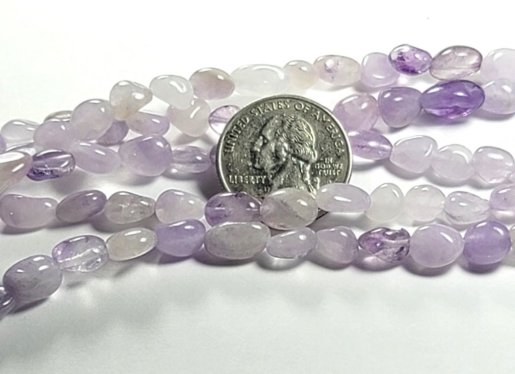 Nugget-shaped lavender quartz gemstone beads, with irregular shapes that average to about 8x6mm. Each lot is one 8-inch strand, which is about 23-25 beads. You will receive beads from the same batch as those pictured; these are representative of the actual beads being sold here, not picked through for the best examples. The hole size is approximately 1mm. Please note that these are natural products with the attendant variations in color and shape, and the appearance may change slightly from one monitor to another. Check out our other products for an amazing selection of beads, cabochons and findings, and to save big on shipping.